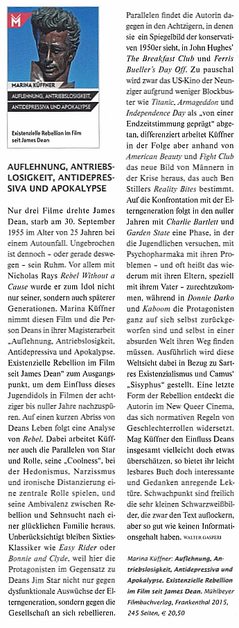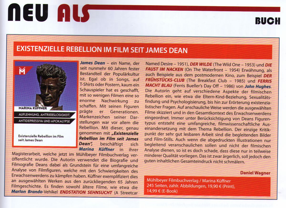 Mit nur drei Filmen wurde James Dean nach seinem tragischen Tod 1955 zu einem Mythos, der bis heute anhält. Wodurch entstand dieser Hype um den jungen Mann, und wieso können sich Jugendliche bis heute mit seinen im Film dargestellten Ängsten und Aggressionen identifizieren? Marina Küffner untersucht in "Auflehnung, Antriebslosigkeit, Antidepressiva und Apokalypse – Existenzielle Rebellion im Film seit James Dean" das Image von James Dean und rückt den Film "… denn sie wissen nicht, was sie tun" / "Rebel Without a Cause" in den Fokus der filmwissenschaftlichen Analyse, um davon ausgehend das Erbe Deans in späteren Coming‑of‑Age‑Filmen zu erörtern: Die Auseinandersetzung mit der Elterngeneration, mit Sinn und Absurdität des Lebens und mit Sexualität.