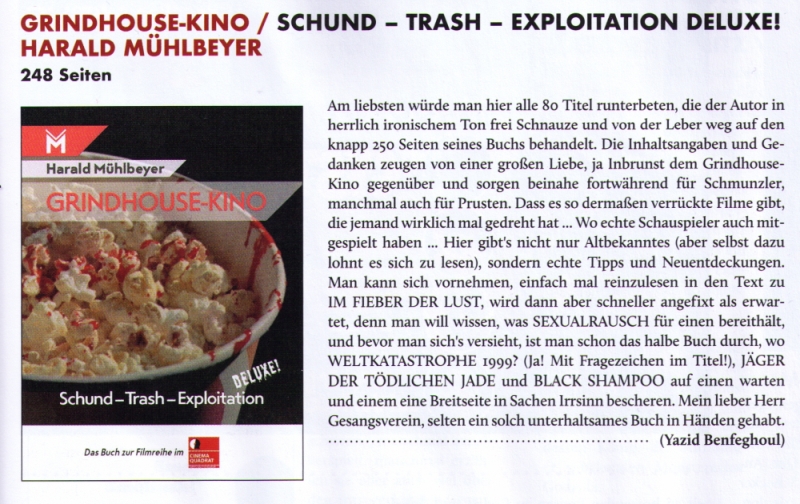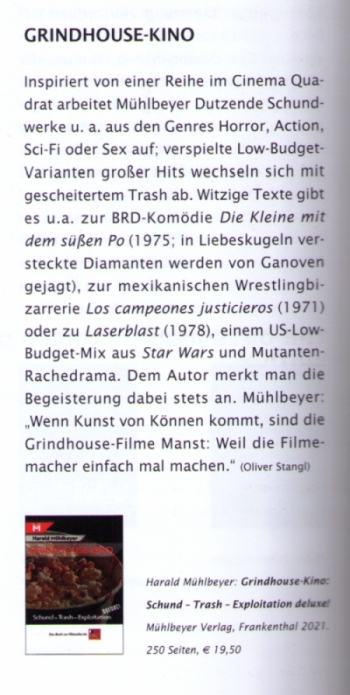 Seit 2007 lässt das Mannheimer Cinema Quadrat in der Filmreihe Grindhouse Double Feature allmonatlich diese besondere Form des Kinos und des Filmgenusses aufleben – Kostbarkeiten, die mit Lächerlichkeit punkten oder die fies ins Gehirn kriechen, auf jeden Fall Filme, die man sonst nicht zu sehen bekommt: Horror, Action und Krieg, Blaxploitation, Western, Science Fiction, Bumsfilme und vieles mehr. Harald Mühlbeyer war von Anfang an dabei: In "Grindhouse-Kino" bündelt er assoziativ-verspielte Essays, in denen er seine Filmerfahrungen verarbeitet – und die nichts ernst nehmen außer dem, was die Bilder der Grindhouse-Filme auslösen. Nämlich meistens Lachen, manchmal Erschrecken, und immer wieder ganz neue Einsichten: Grindhouse-Filme als Zeitgeisterbahnfahrten.