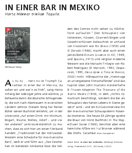 "Reiner Boller unternimmt in seinem Buch eine filmhistorische Reise, in der 42 Filme ausführlich vorgestellt werden, in denen mexikanischen Bars eine wichtige Rolle spielen."