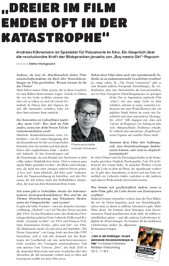 Seit jeher ist boy meets girl die Prämisse der Liebesfiktion – und boy gets girl beziehungsweise boy loses girl deren Schlusspunkt. In der filmischen Darstellung der Liebe zwischen zwei Figuren unterschiedlichen Geschlechts haben sich etliche dramaturgische und ästhetische Konventionen entwickelt. Doch welche Herausforderungen ergeben sich, wenn ein Film von der Liebe zwischen einem boy, einem girl und einer zusätzlichen, dritten Person handelt? Wenn die Liebe in diesem Figuren- und Beziehungsdreieck in alle Richtungen verläuft und somit eine sexuelle Ambivalenz ins Spiel kommt? Wenn es nicht (nur) um das Glück zu zweit, sondern zu dritt geht?