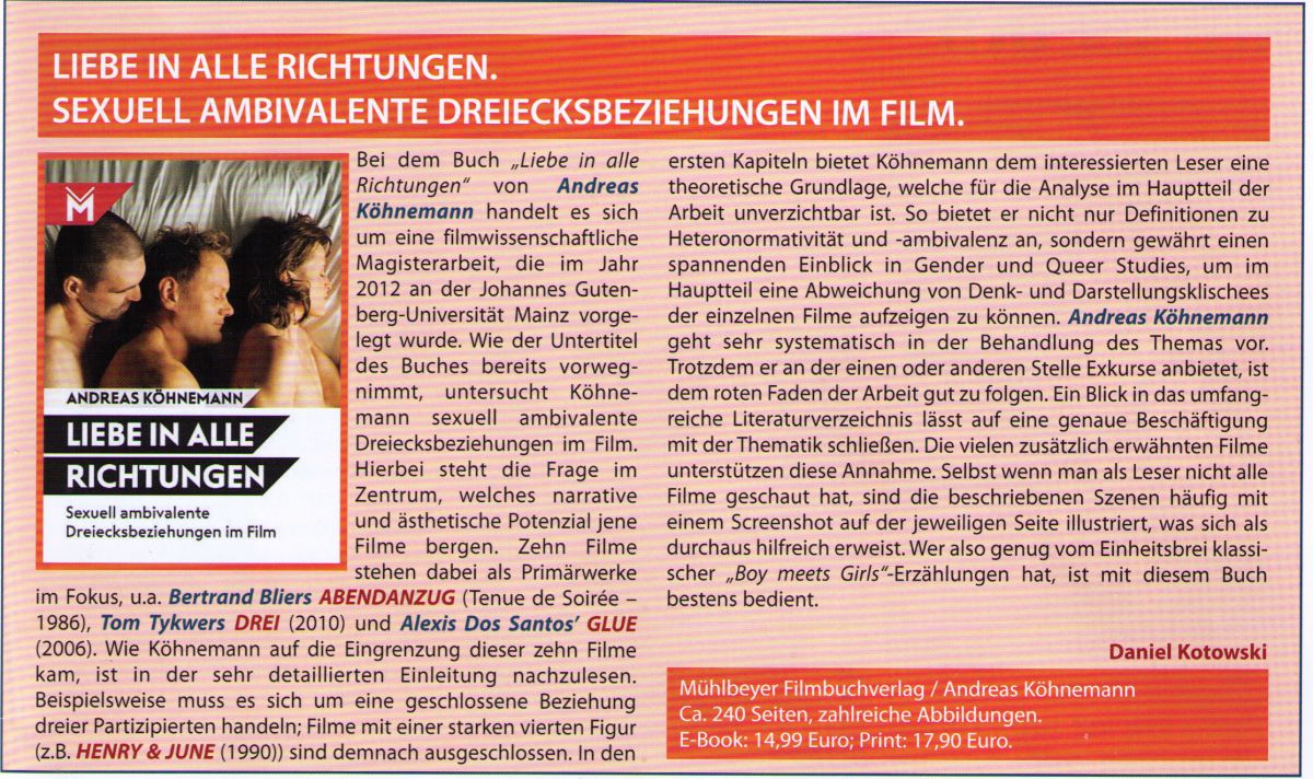 Andreas Köhnemann nimmt die erzählerischen und inszenatorischen Strategien in den Blick, die bei einer Abweichung von der herkömmlichen "Junge trifft Mädchen"-Liebesfilmformel zum Einsatz kommen können. Eingebettet in literatur- und filmwissenschaftliche sowie gender- und queertheoretische Kontexte werden zehn Filme einer eingehenden Untersuchung unterzogen: Claude Chabrols "Zwei Freundinnen", Bertrand Bliers "Abendanzug", Andrew Flemings "Einsam, zweisam, dreisam", Gregg Arakis "The Doom Generation", Anne Fontaines "Eine saubere Affäre", Michael Mayers "Ein Zuhause am Ende der Welt", Alexis Dos Santos’ "Glue", Adam Salkys "Dare – Hab’ keine Angst, tu’s einfach!", Tom Tykwers "Drei" sowie Xavier Dolans "Herzensbrecher".