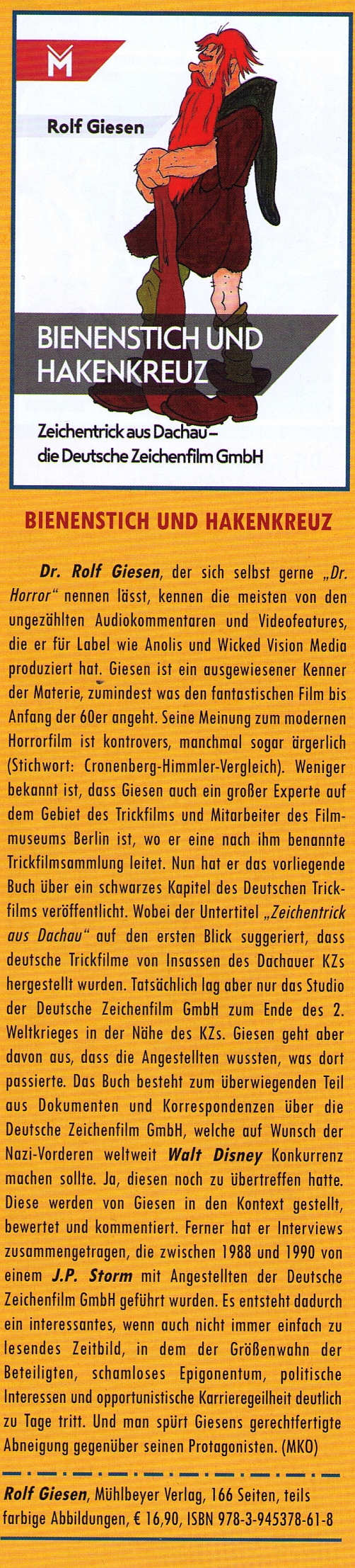 "In Bienenstich und Hakenkreuz geht der Filmwissenschaftler Rolf Giesen der kurzen und skurrilen Geschichte der Disney-Imitation von Joseph Goebbels’Gnaden auf den Grund. Die Basis bilden Interviews mit Zeitzeugen."